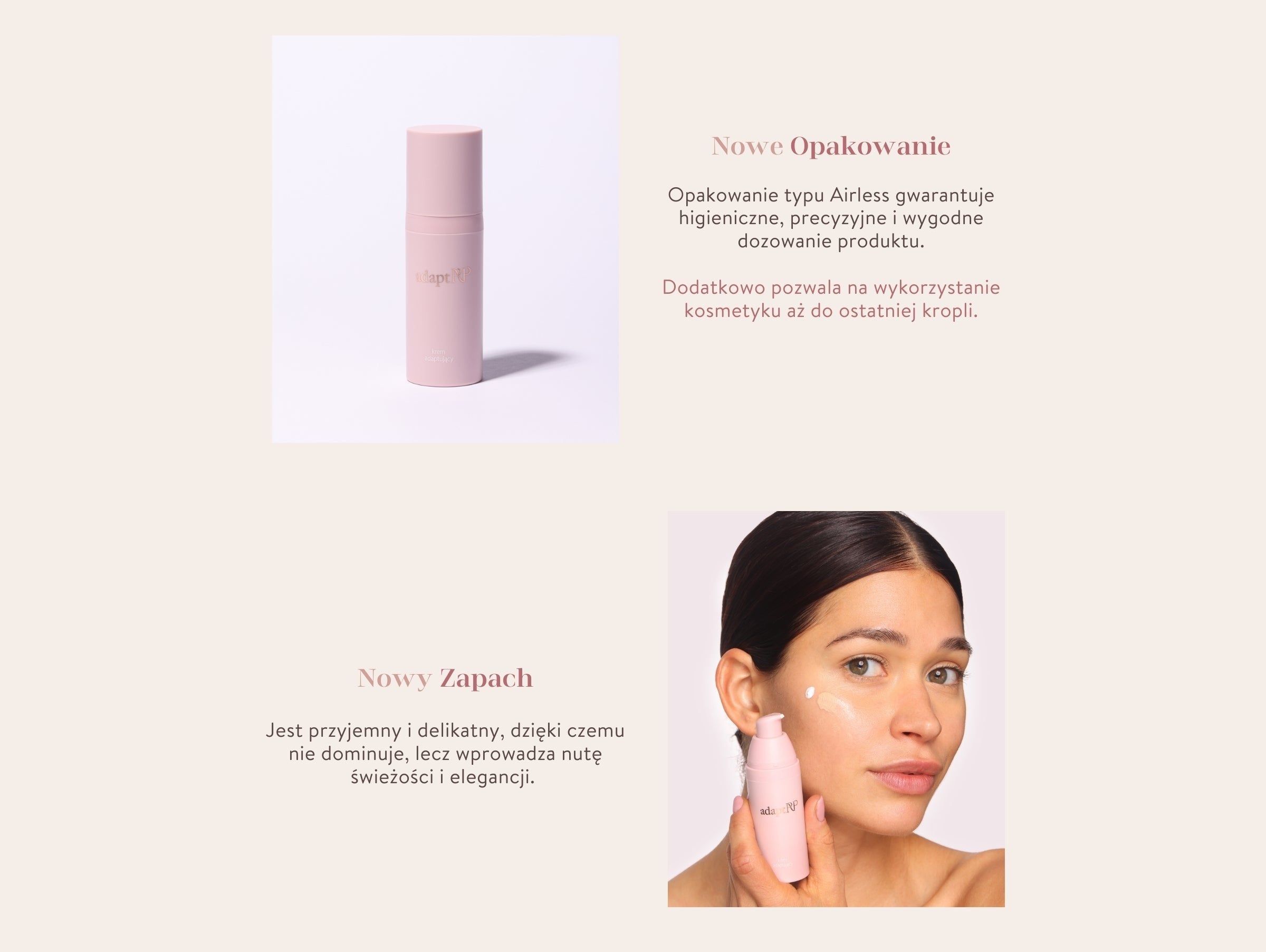 Adapter jest produktem o większym poziomie krycia niż baza. Oba produkty różnią się także wykończeniem – baza jest zdecydowanie produktem rozświetlającym, a krem adaptujący jest produktem zapewniającym satynowe wykończenie.