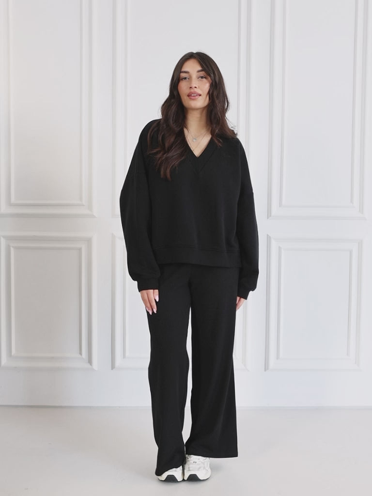 Bluza wykonana z miękkiej, ciepłej dresówki o pudełkowym kroju. Posiada dekolt w serek. Wykończona ściągaczem.