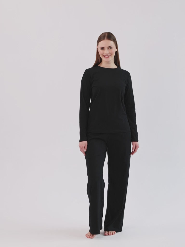 Bluzka damska z długim rękawem uszyta ze 100% bawełny. Ma dekolt w łódkę i luźny krój.