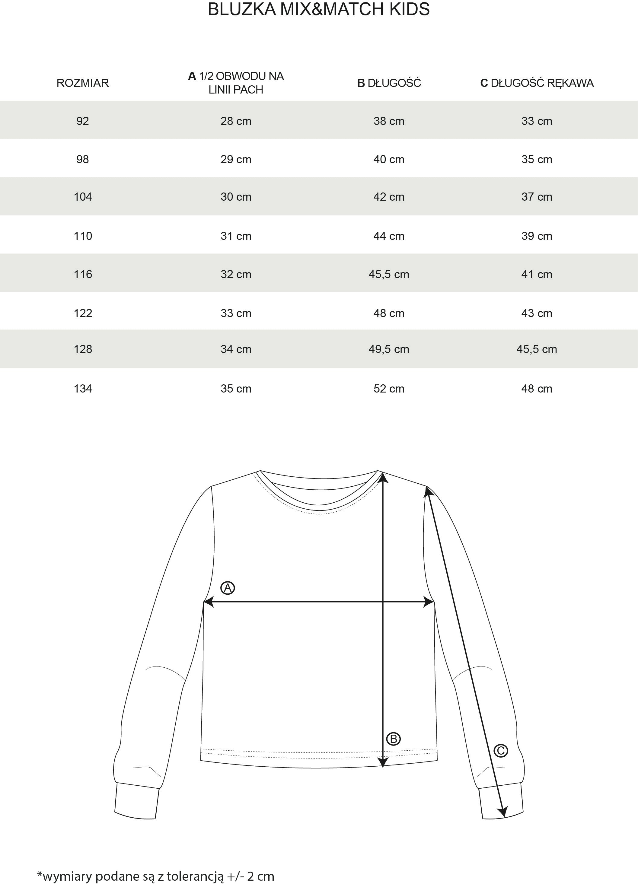 Bluzka Mix&Match kids uszyta ze 100% dzianiny bawełnianej. Ma okrągły dekolt i długie rękawy. Dostępna w rozmiarach 92-134.