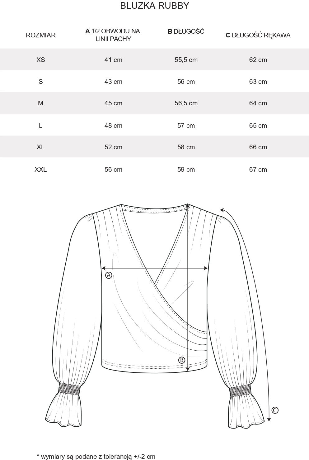 Bluzka o kopertowym kroju z delikatnym marszczeniem na wysokości brzucha. Ma długie, bufiaste rękawy które zostały przeszyte gumoniciami, tworząc efektowne marszczenie i zakończenie falbanką.