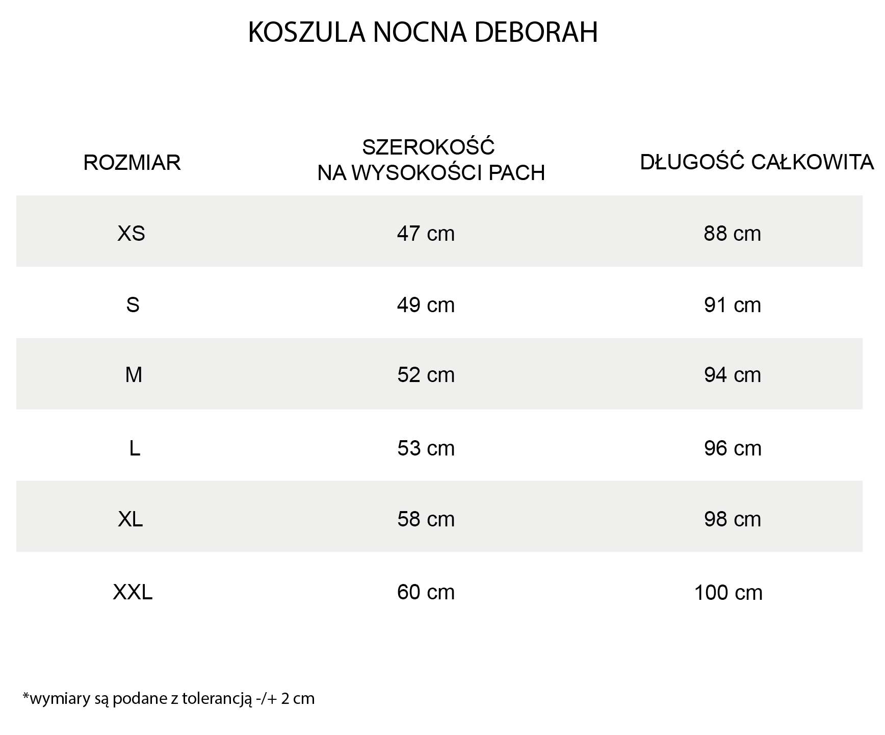 Koszula nocna damska Deborah uszyta ze 100% bawełny. Ma okrągły dekolt, grube ramiączka oraz odcięcie i marszczenia poniżej dekoltu. Góra koszuli zdobiona jest haftem i zapinana na zatrzaski. Koszula nocna damska Deborah sięga przed kolano. Dostępna jest od rozmiaru XS do rozmiaru XXL. Jest idealna również dla kobiet karmiących.
