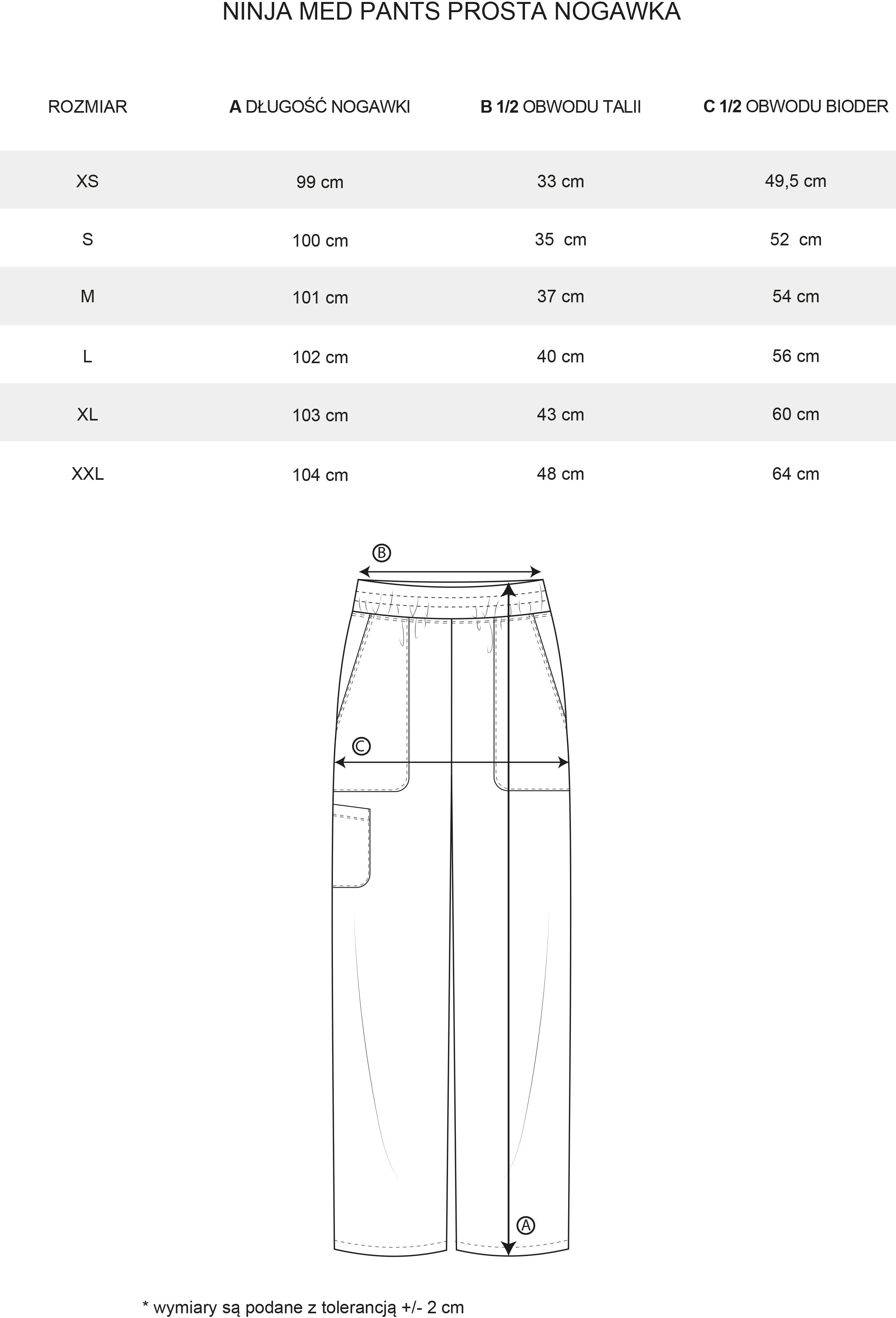 Spodnie medyczne uszyte z elastycznej tkaniny, która zapewnia komfort i swobodę ruchów.