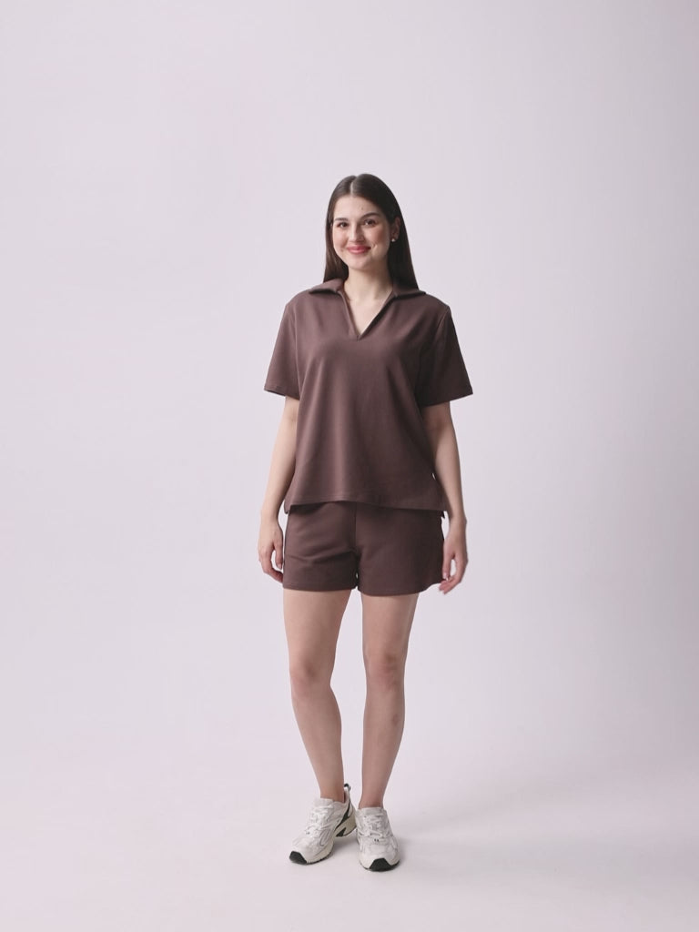 Nasz kultowy zestaw uszyty z miękkiej i elastycznej dzianiny. Szorty z wysokim stanem, gumą w pasie i kieszeniami. Luźna bluzka z krótkim rękawkiem, dekoltem w serek i kołnierzykiem.