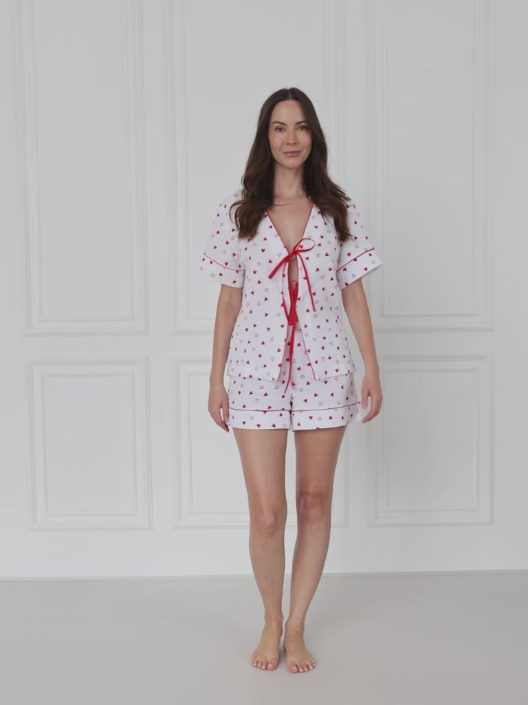 Dwuczęściowa muślinowa piżama damska z printem. Składa się z góry na krótki rękaw z wiązaniami, oraz z krótkich spodenek.