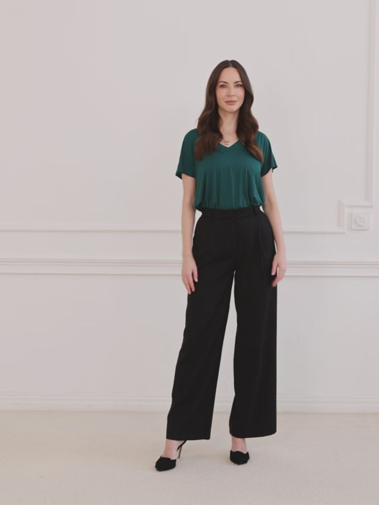 Eleganckie spodnie garniturowe z szeroką nogawką. Posiadają dwie boczne kieszenie, szlufki na pasek oraz zapięcie na haftkę i suwak.