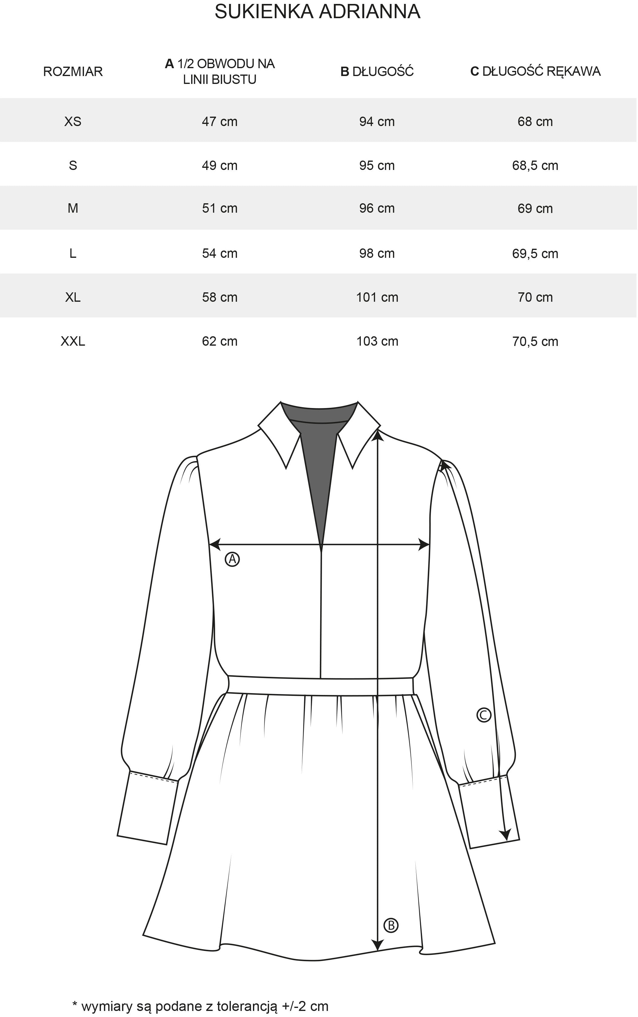 Elegancka sukienka mini uszyta z satynowanej wiskozy. Posiada zbluzowaną górę z dekoltem w serek i klasycznym kołnierzykiem oraz rozkloszowany dół, który pięknie układa się w ruchu. Ma długie, obszerne rękawy zakończone mankietem na jeden guzik.