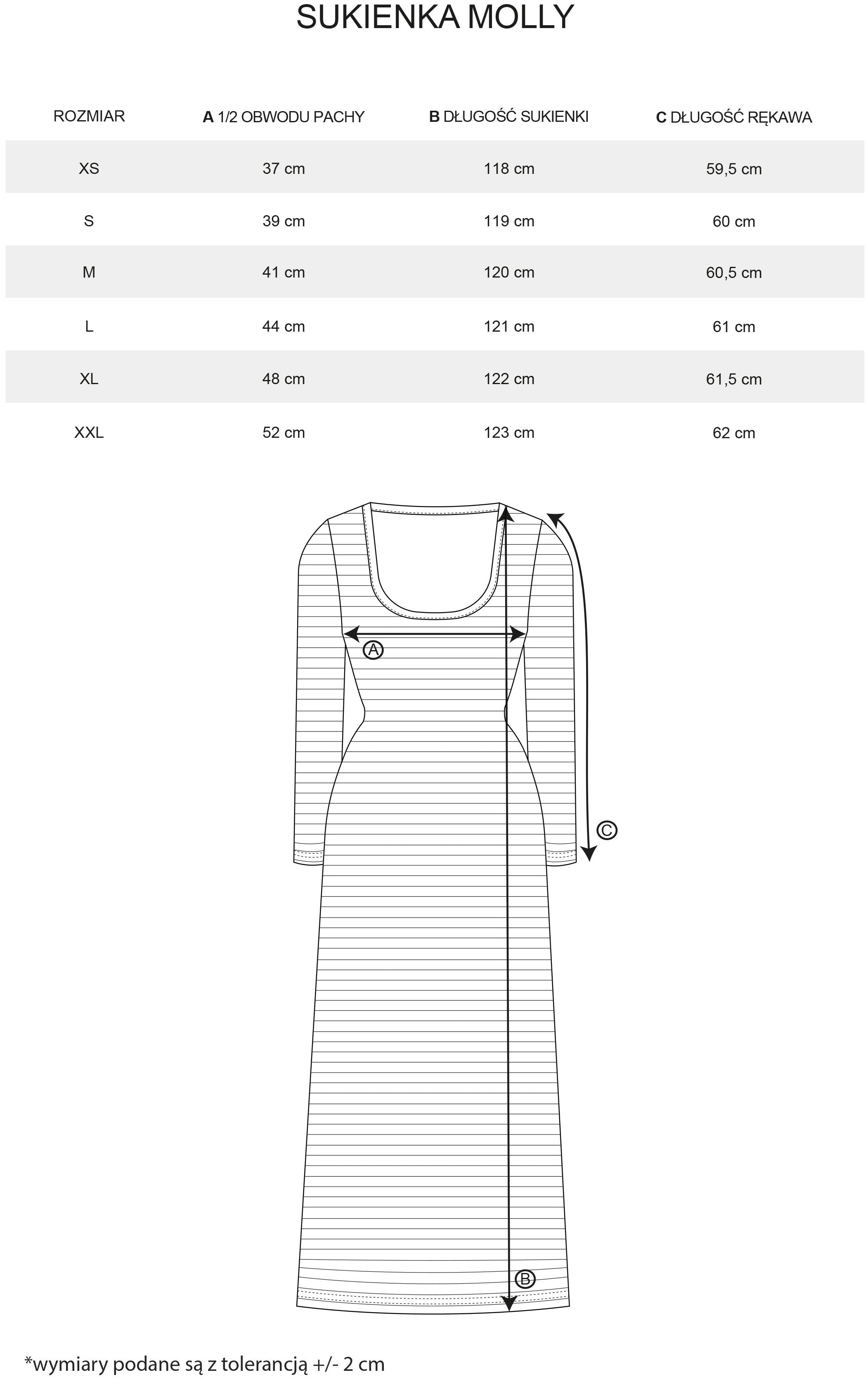Sukienka z długimi rękawami uszyta z elastycznej dzianiny. Ma dopasowany krój, dekolt kwadratowy i długość maxi.
