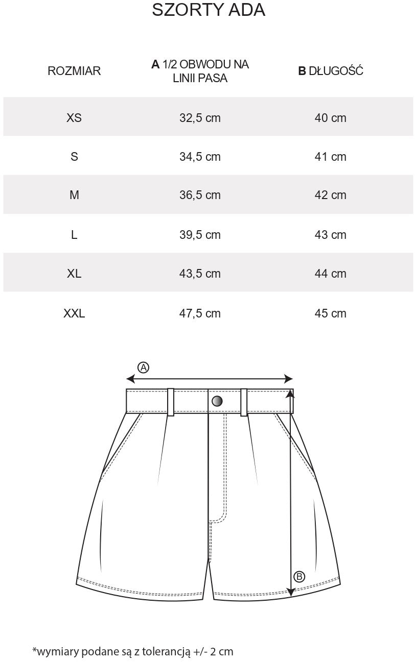 Krótkie szorty z eleganckim wykończeniem i lekko rozszerzanym krojem, który podkreśla sylwetkę. Posiadają dwie kieszenie, szlufki na pasek oraz zapięcie na guzik i suwak.