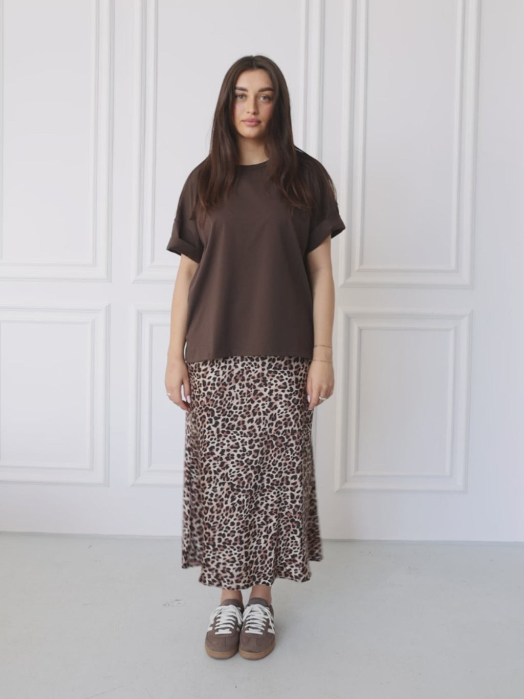T-shirt o kroju oversize uszyty z bawełny z dodatkiem elastanu. Ma krótkie rękawy i okrągły dekolt.