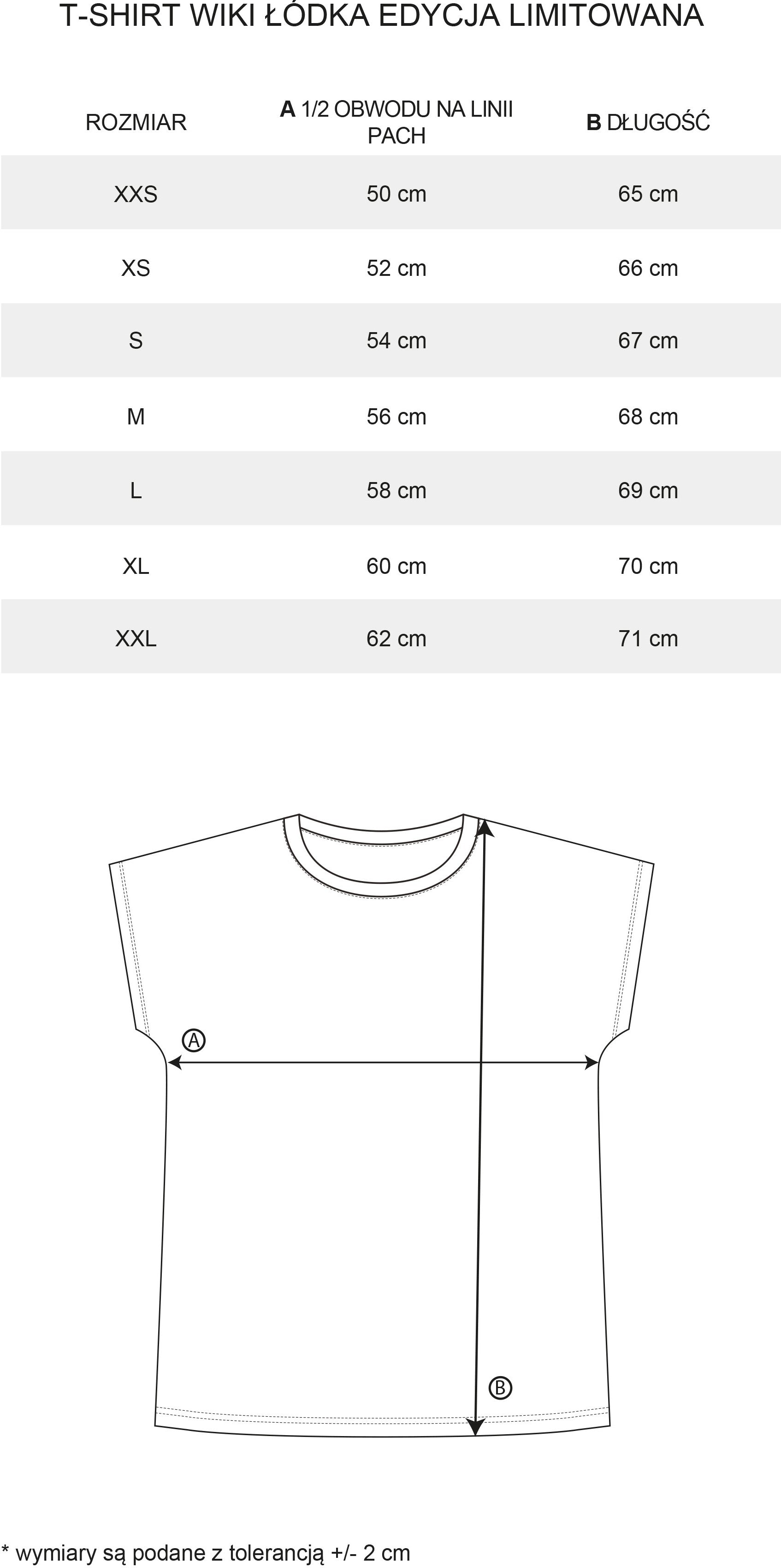 T-shirt Wiki uszyty jest z wiskozy z dodatkiem elastanu. Ma okrągły dekolt i luźny krój. Wyprodukowano w Polsce.