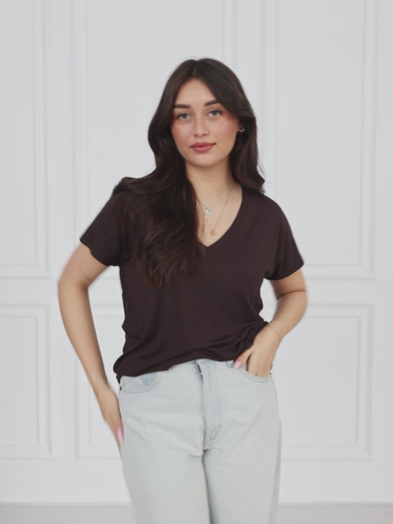 T-shirt damski w serek uszyty z wiskozy z dodatkiem elastanu.